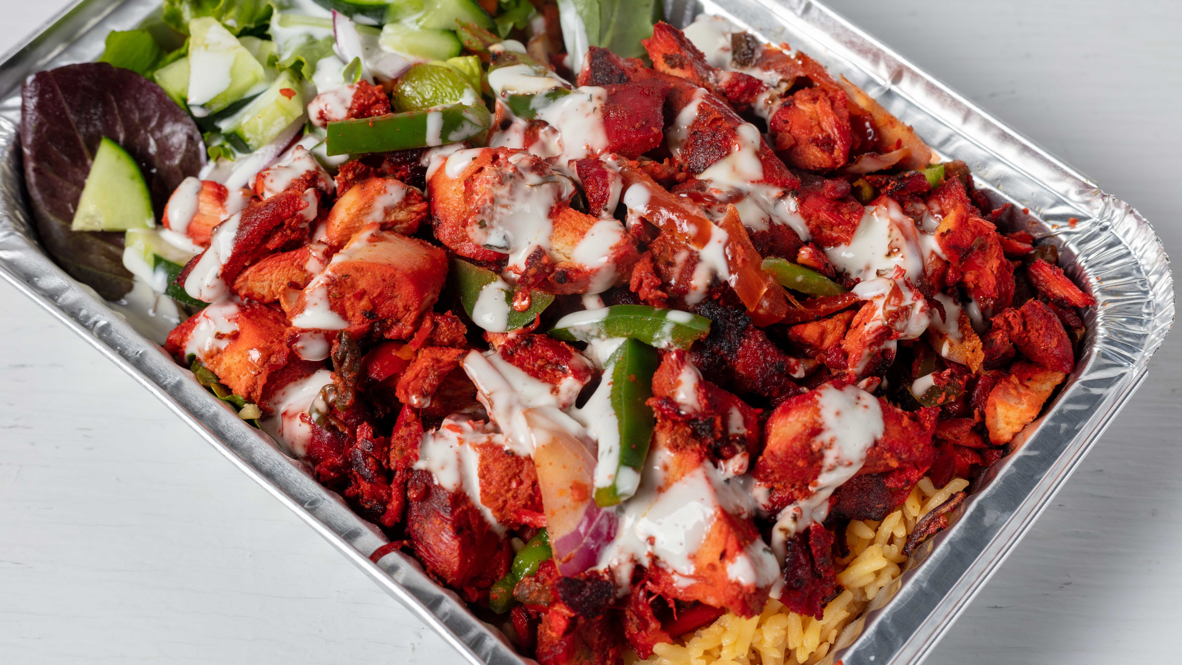 ARABIAN SPICED CHICKEN WITH RICE, ONIONS, PEPPERS, SALAD, WHITE & HOT SAUCE.