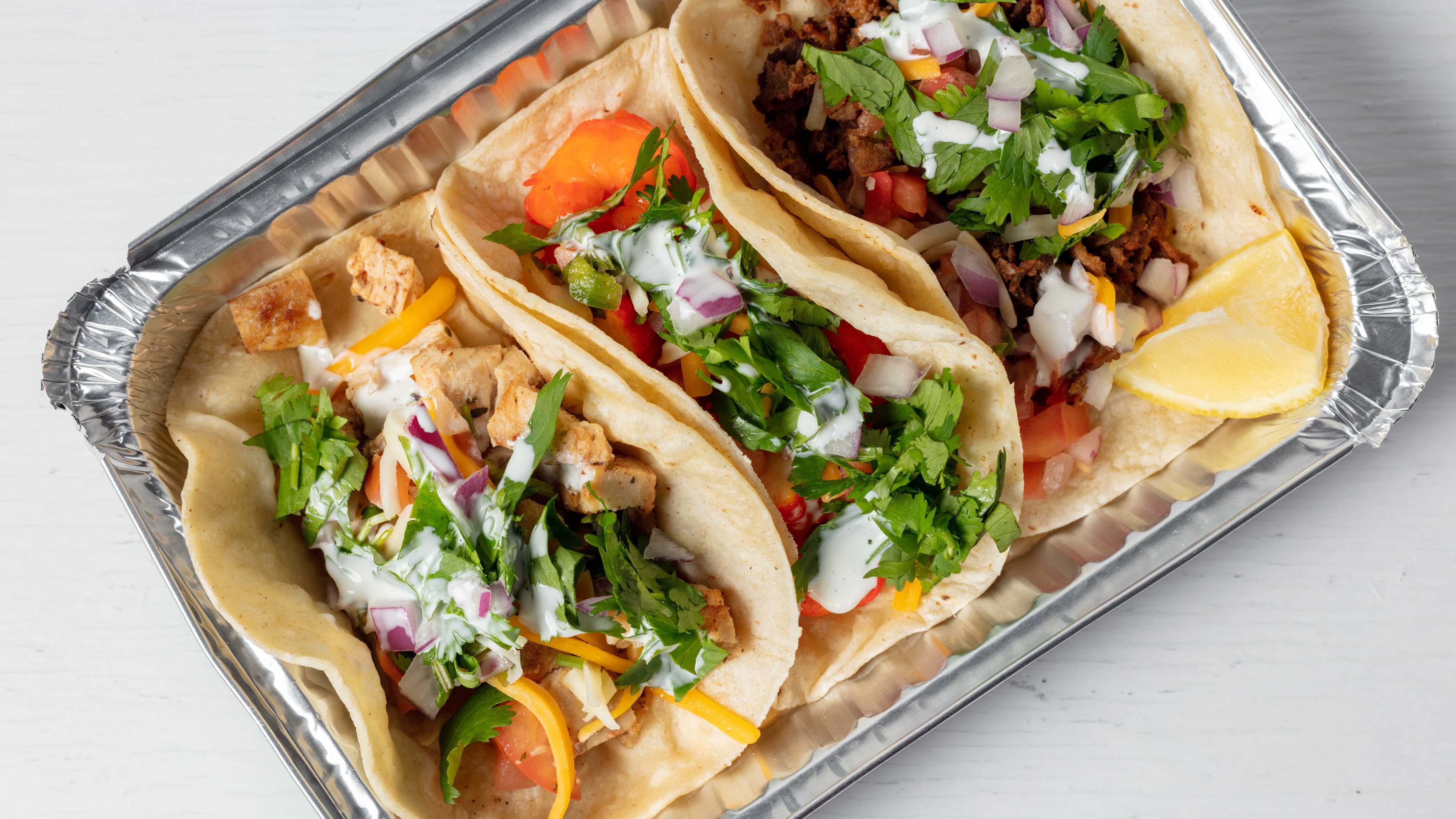 CHOPPED SOY BEEF WITH ONIONS, PEPPERS, MELTED VEGAN CHEDDAR CHEESE, ROMAINE AND TOMATOES.