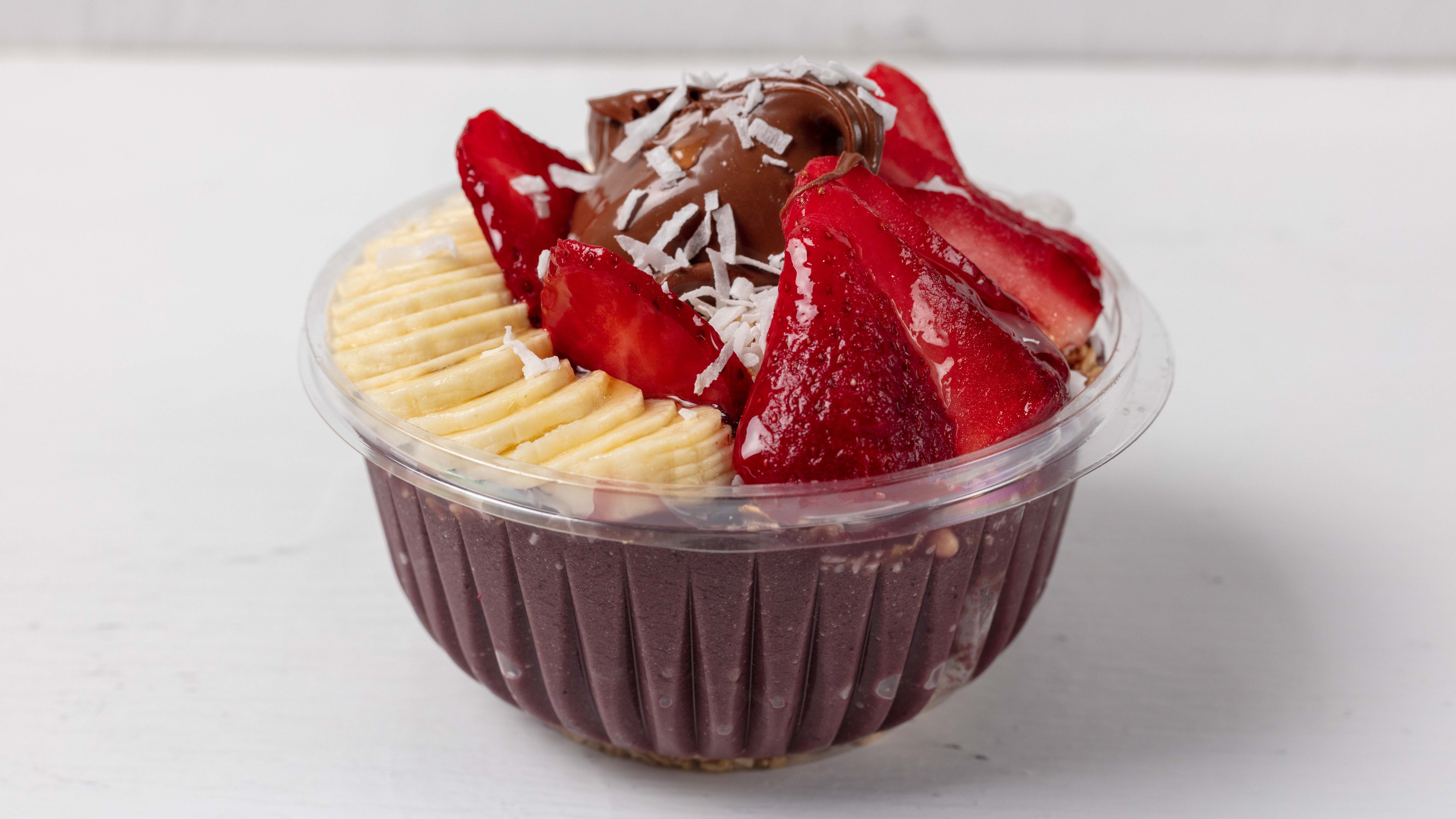 Acai topped with banana, strawberry, granola, coconut shavings, and Nutella.