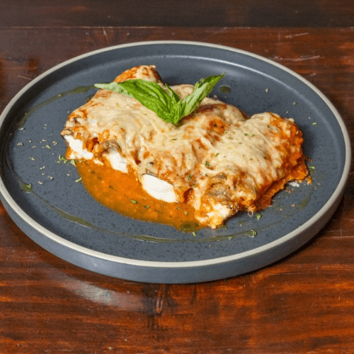 Eggplant rollatini stuffed with ricotta & pecorino cheese, herbs, tomato sauce