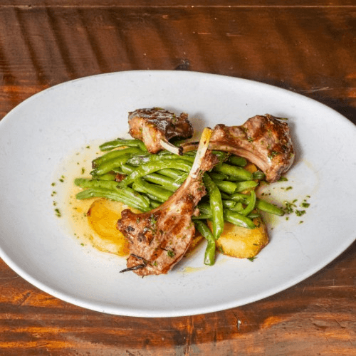 Three grilled lamb chops, string beans and roasted potatoes