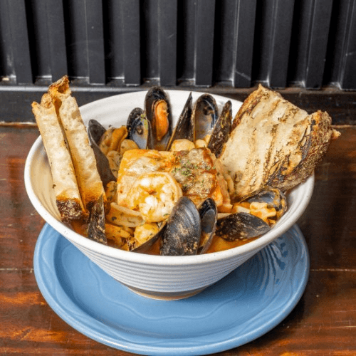 Tuscan style mixed seafood stew topped with salmon in tomato sauce dipped with garlic toasted bread