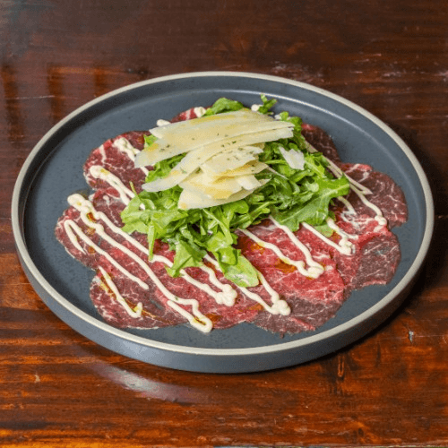 Thin-sliced beef tenderloin, arugula, shaved Parmesan in EVOO