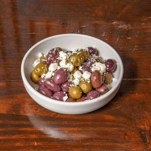 Mixed olives, feta cheese, herbs in EVOO