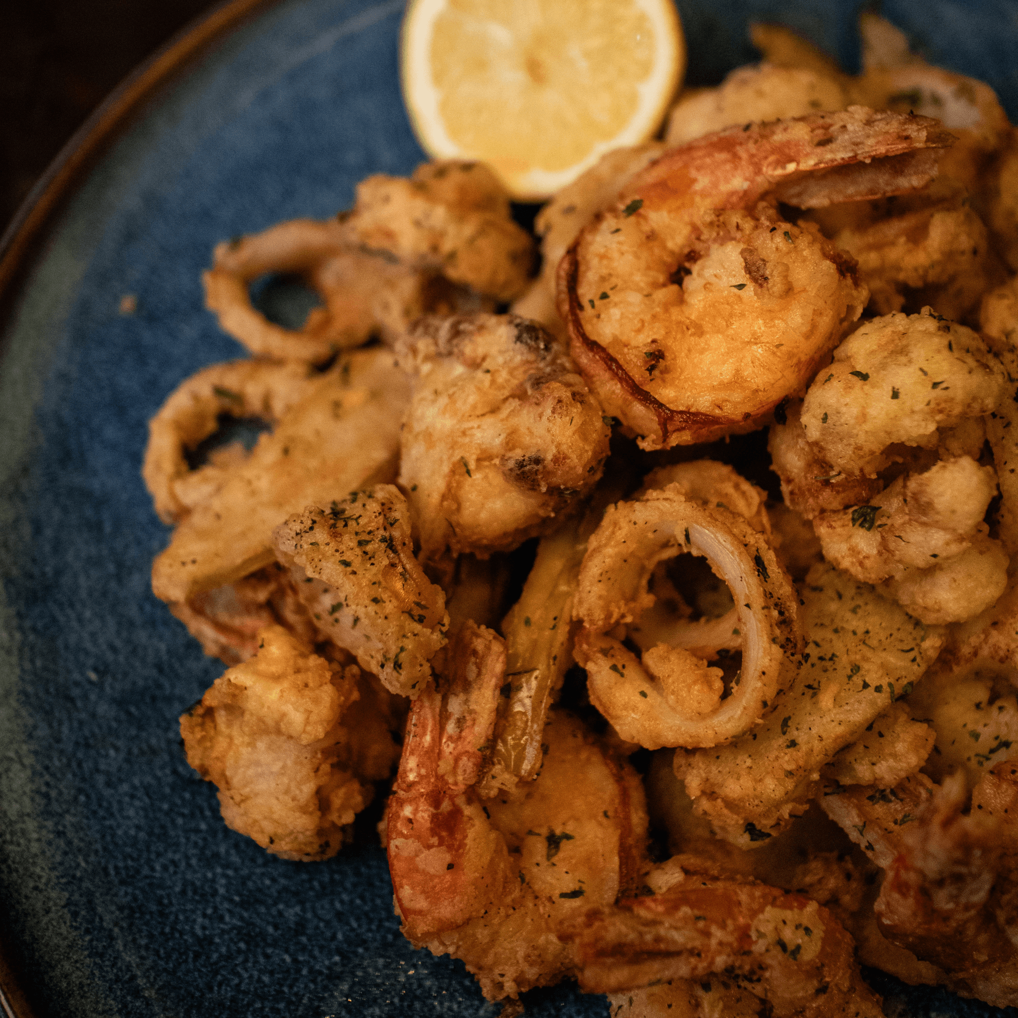 Roman style Fried calamari, zucchini, green apples, cauliflowers