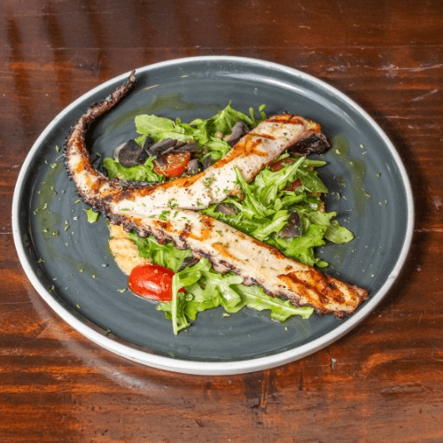 Served over homemade hummus, capers, cherry tomatoes and olives