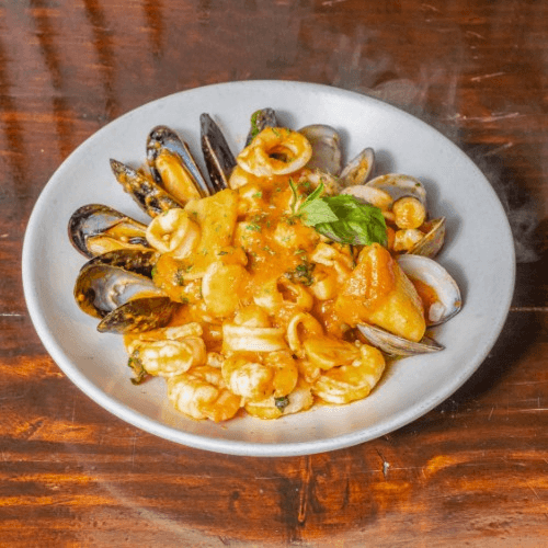 Large rigatoni pasta, mix seafood in tomato sauce