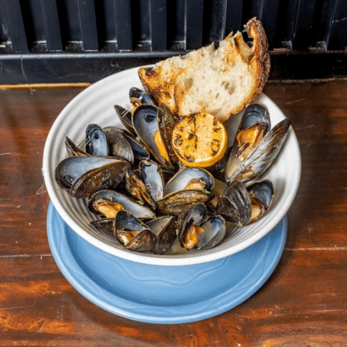 Mussels in lemon white wine sauce served with toasted Tuscan bread