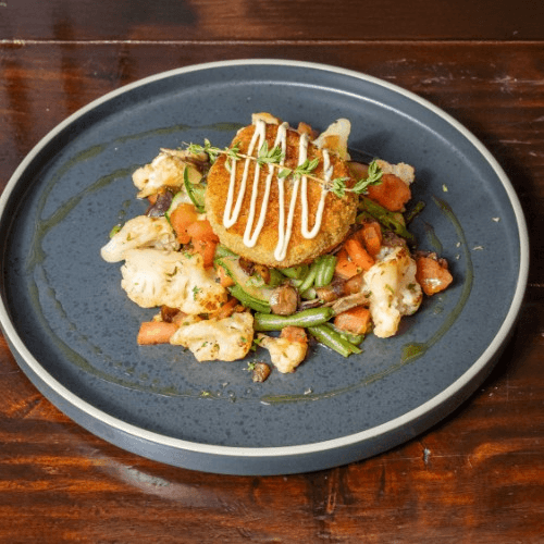 Grilled salmon over seasonal veggie and roasted potatoes topped with fried onion and roasted tomato