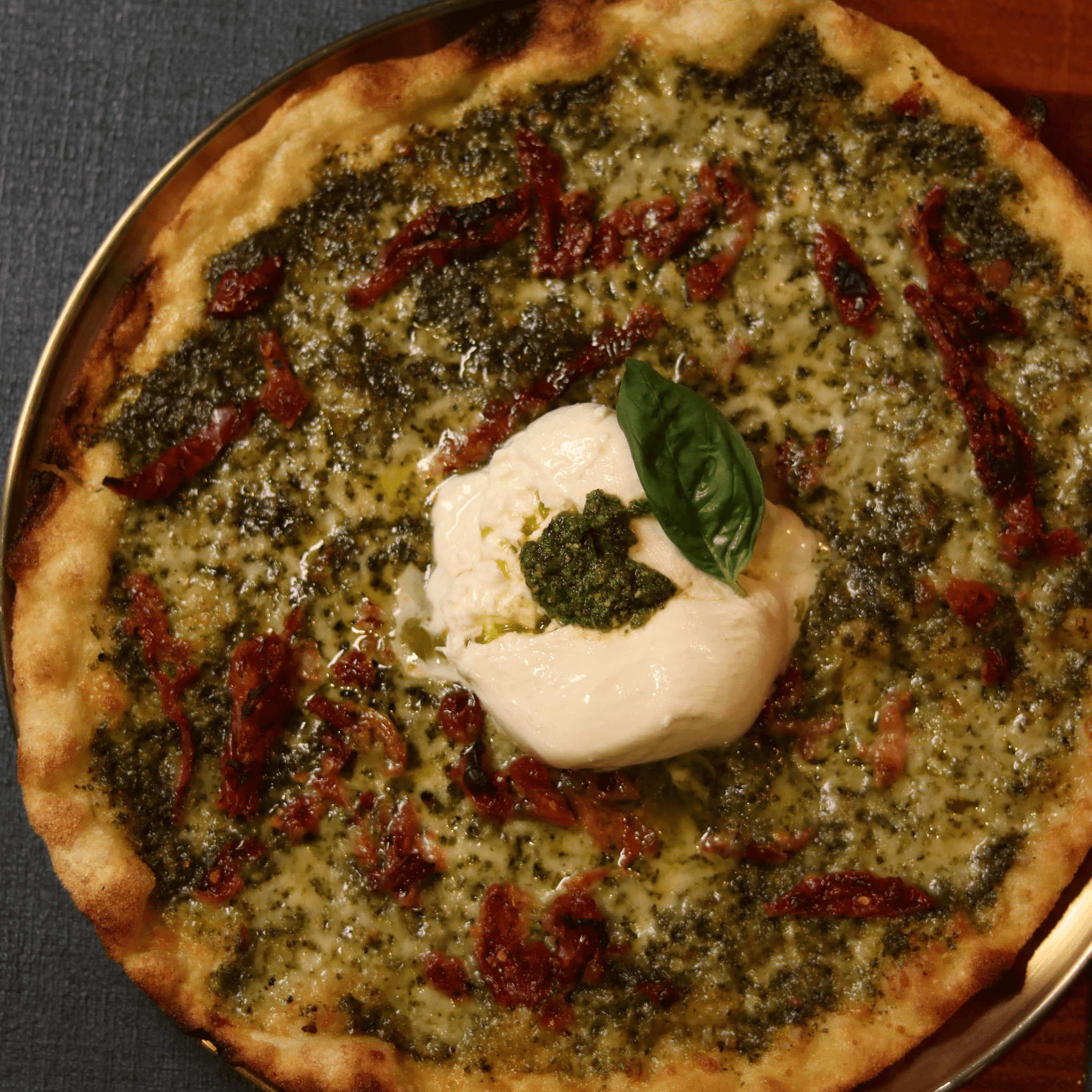 Homemade basil pesto, mozzarella, sun dried tomatoes and imported burrata