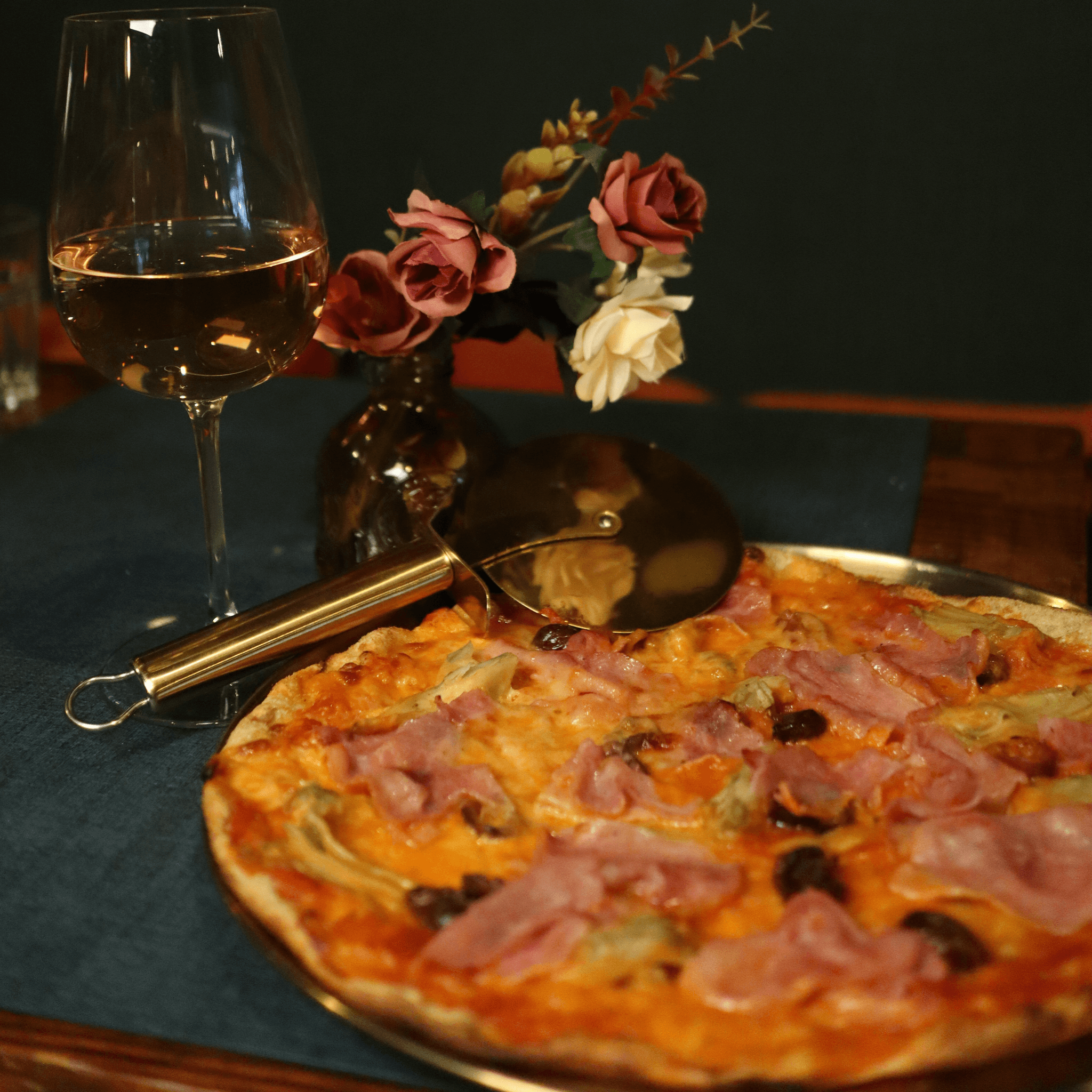Artichokes, ham, mushrooms, olives, San Marzano tomato sauce, and mozzarella