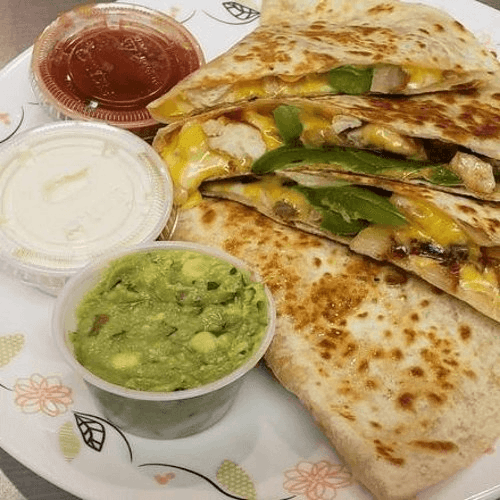 Cheddar Jack cheese with grilled peppers, onions on a plain or whole wheat flour tortilla. Salsa, sour cream, and guacamole on the side. Choice of meat.