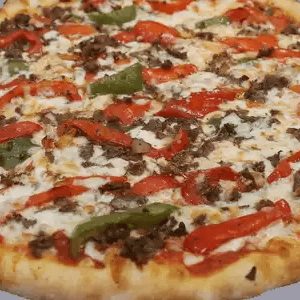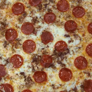 Pepperoni, sausage, mushrooms, peppers, and chicken