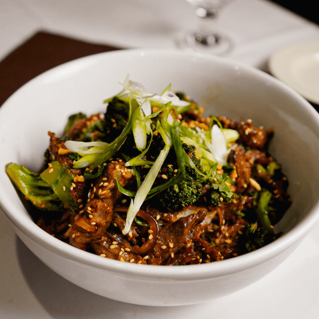 Teriyaki-glazed sliced steak with broccoli. Choose a base: white rice, yellow rice, penne, fettuccine.
