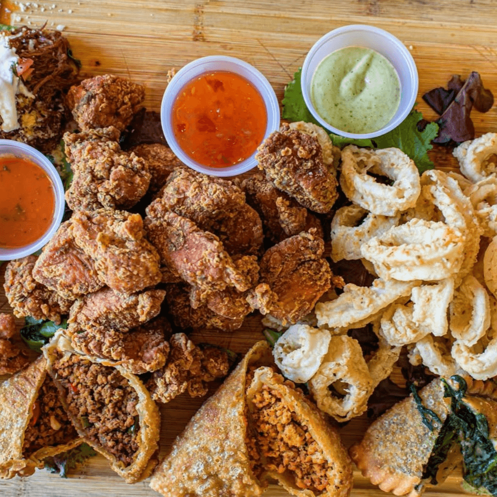 Serves 2 people. Chicharrón de pollo, empanadas trio, fried calamari, alitas, and tostones mechada