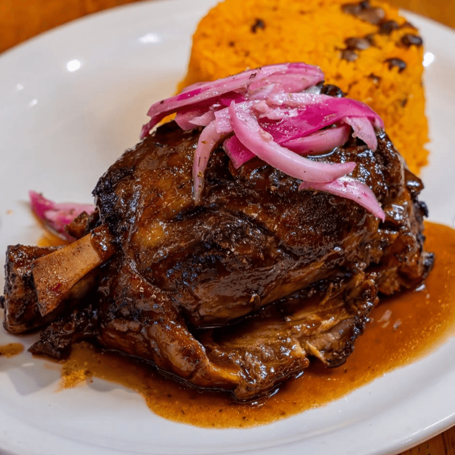 Slow braised pork shoulder with our "Sexy sauce" served with arroz con gandules and pickled onions