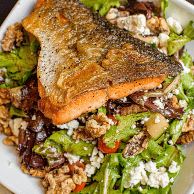 Fresh mixed greens with cucumber, tomato, walnuts, and goat cheese, tossed in our signature red sangria vinaigrette.