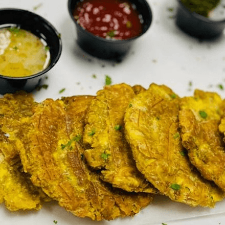 A classic Puerto Rican dish of mashed fried green plantains with garlic served with your choice of savory topping.