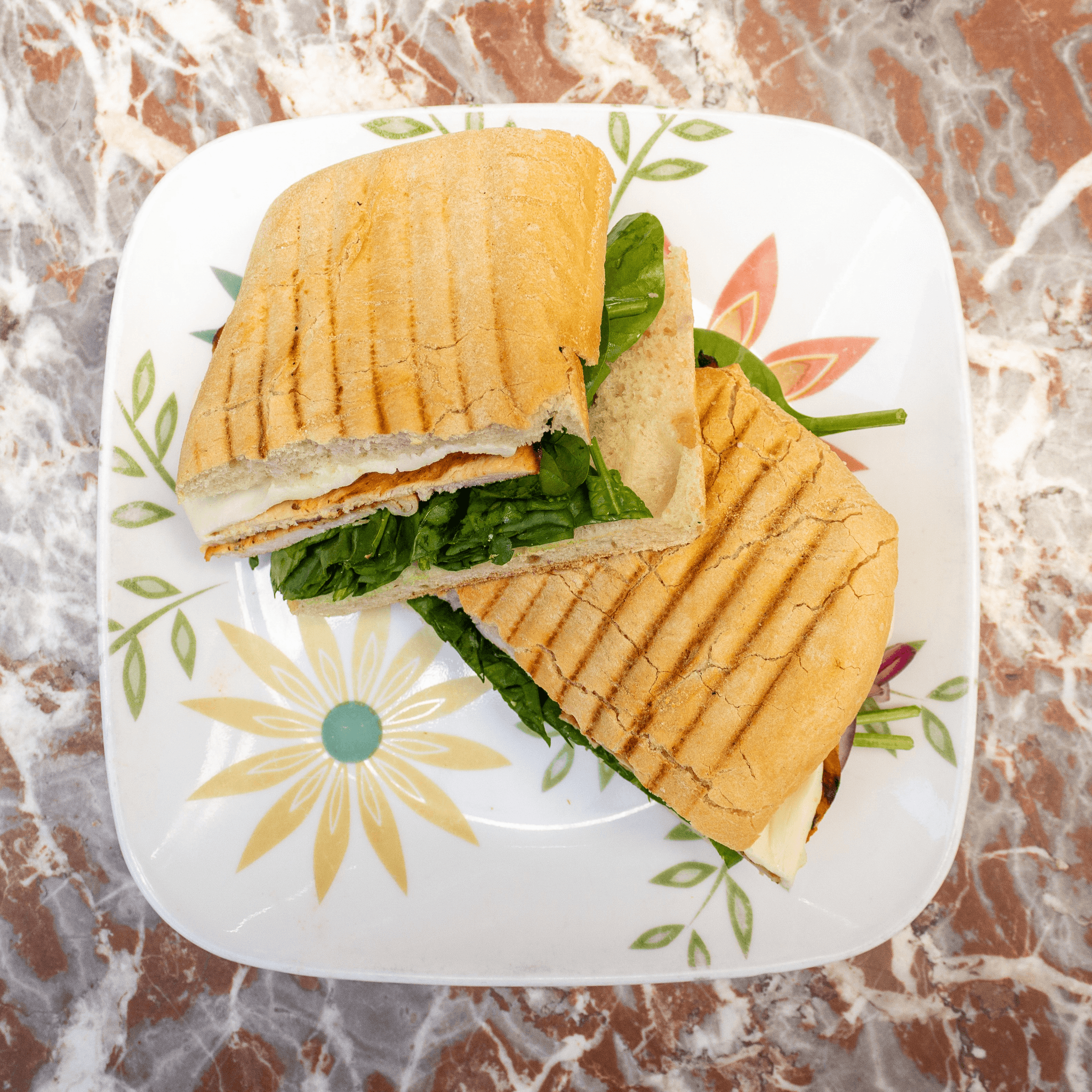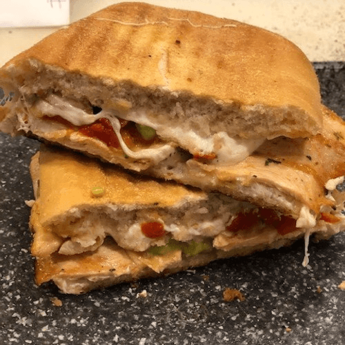 Grilled Chicken, Mozzarella, Spinach, Garlic Sauce, Onions on Ciabatta